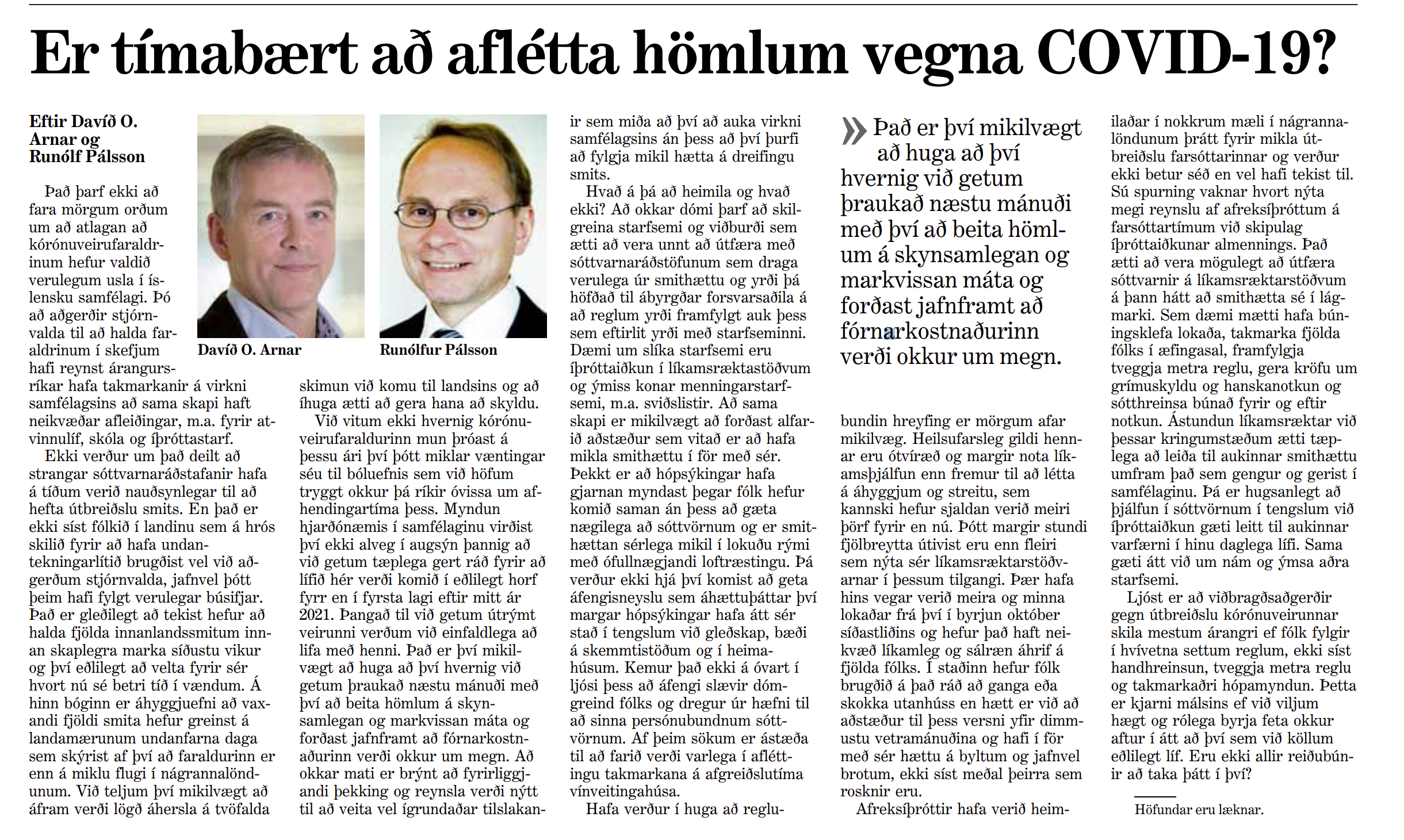 Í greininni segja þeir að tæplega megi gera ráð fyrir að lífið hér verði komið í eðlilegt horf fyrr en í fyrsta lagi eftir mitt ár 2021. „Að okkar mati er brýnt að fyrirliggjandi þekking og reynsla verði nýtt til að veita vel ígrundaðar tilslakanir sem miða að því að auka virkni samfélagsins án þess að því þurfi að fylgja mikil hætta á dreifingu smits.“